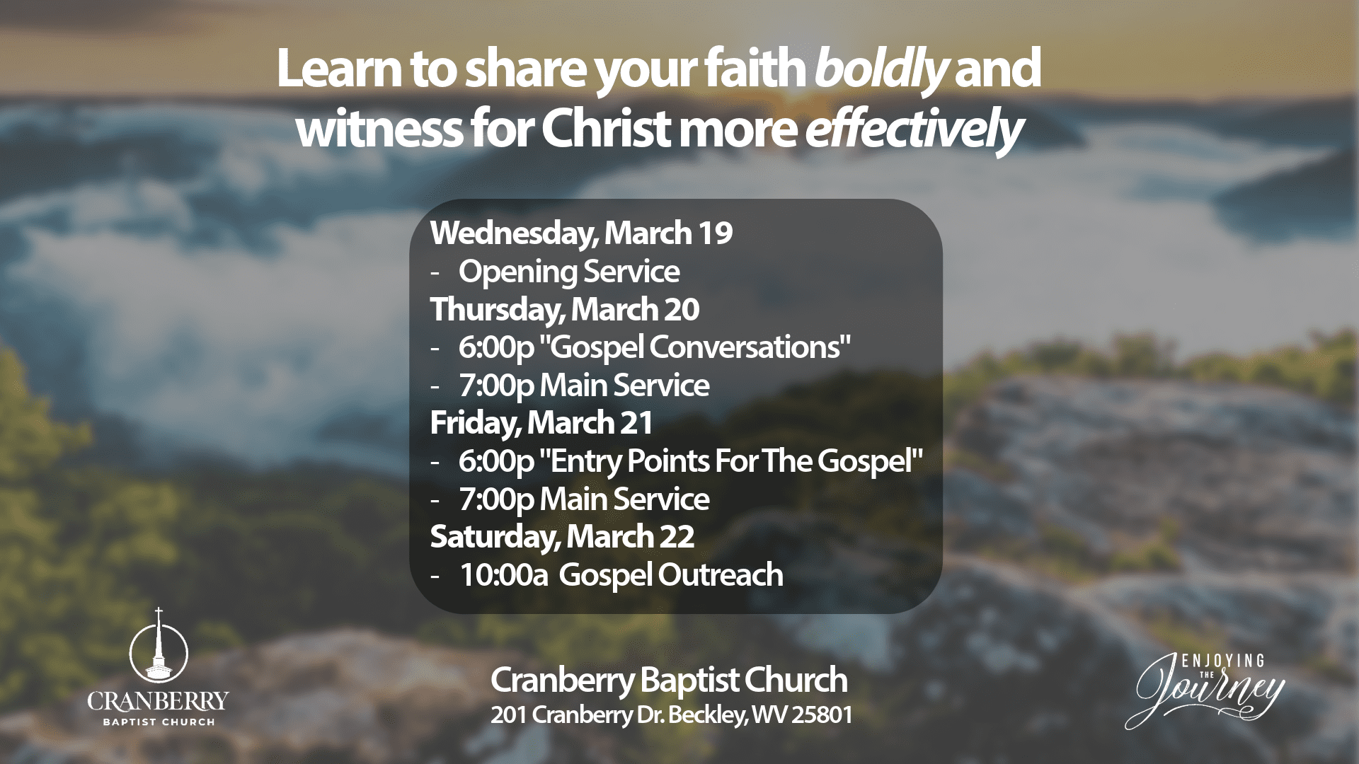 We are thrilled to partner with our sending church, Cranberry Baptist Church, to host a Southern West Virginia Gospel Advance. Our heart is to get the gospel to our region and to train more witnesses for our Lord Jesus Christ. We would love to have you join us for special gospel training sessions at 6 PM on Thursday and Friday evening. The main service will follow. We are excited to get into God’s Word together. Would you join us in asking God to do a great work in our state? We would be honored for you to meet with us for the special gospel emphasis. If you would like to bring a group from your church, you may contact Cranberry Baptist Church at (304) 252-9631. We look forward to seeing you there!