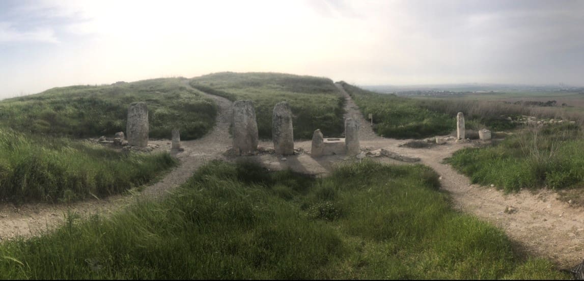 Idolatrous pillars in Gezer. The row contains ten standing stones, an altar, as well as a stone basin. Despite what Deuteronomy commands, the pillars are not broken. Photo by John Buckner